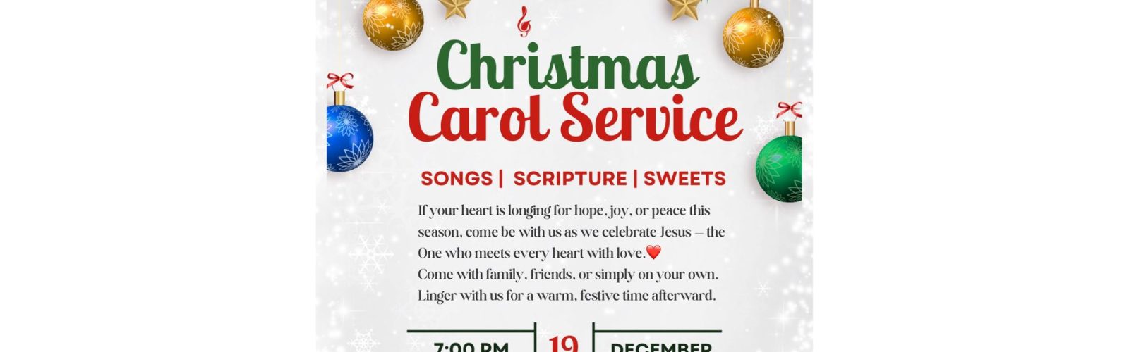Come with family, bring a friend, or come solo — you’ll be welcomed either way. After the service, stay for a warm, festive time of fellowship and desserts.