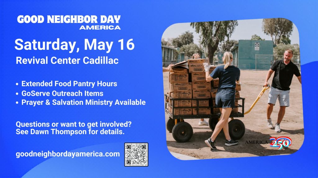 Good Neighbor Day America is a special outreach focused on serving our community and creating space for meaningful connection. Throughout the day, Revival Center will offer extended Food Pantry hours, provide GoServe outreach items, and make prayer and salvation available to anyone in need.