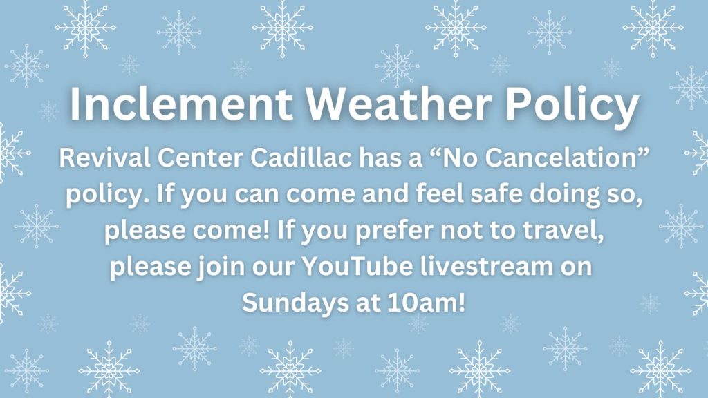 At Revival Center Cadillac, services are never canceled due to weather. If you can travel safely, we’ll be here — doors open, lights on, and coffee hot.