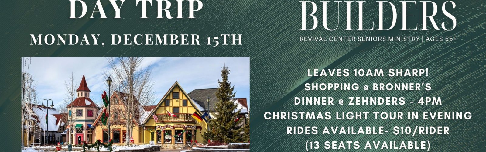 Our 55 and older group is headed to Frankenmuth for a full day of Christmas shopping and sightseeing. We’ll depart the church at 10:00 AM, visit Bronner’s and downtown Frankenmuth, then gather for dinner at Zehnder’s at 4:00 PM. After dinner, we’ll enjoy an evening Christmas lights tour before returning home.