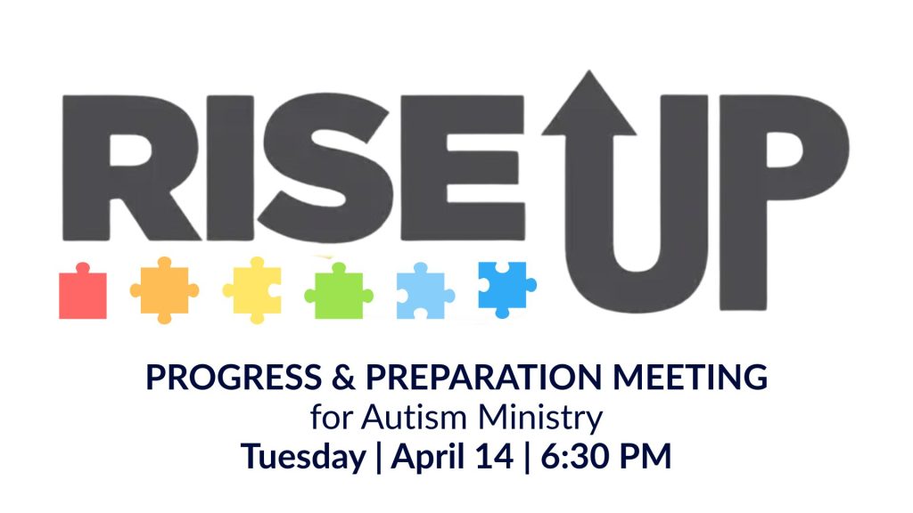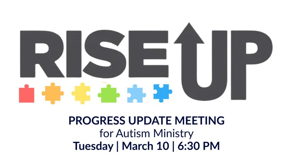 Our RISE UP Ministry continues to move forward as we prepare to serve children and families affected by autism. This Progress Update Meeting will provide an overview of current facility developments, track advancements, and next steps in implementation. Time will also be given for coordination and prayer.